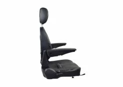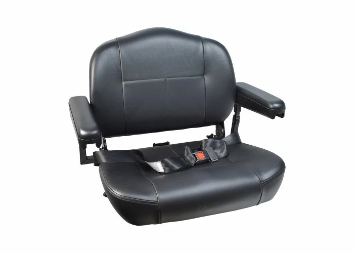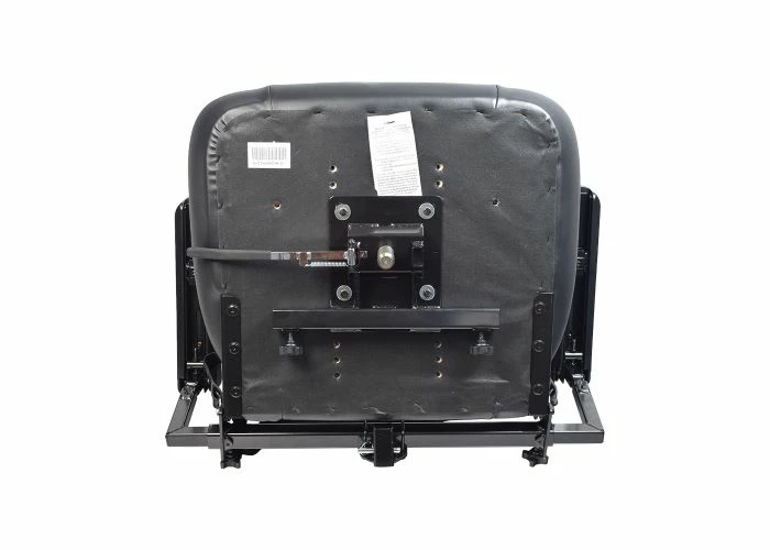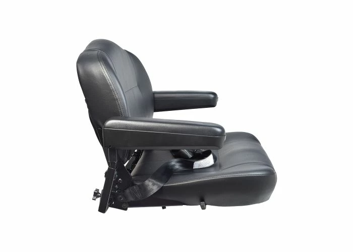 The seat assembly is covered in an easy to clean black vinyl upholstery and Includes both armrests, adjustment knobs, seat belt, steel base plate, and the seat adjustment lever