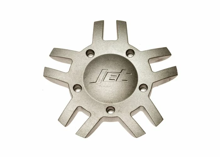 The rim cover for the Jet 2, Jet 10, and Jet 12 power chairs sports the Jet logo on its textured, sandblasted finish