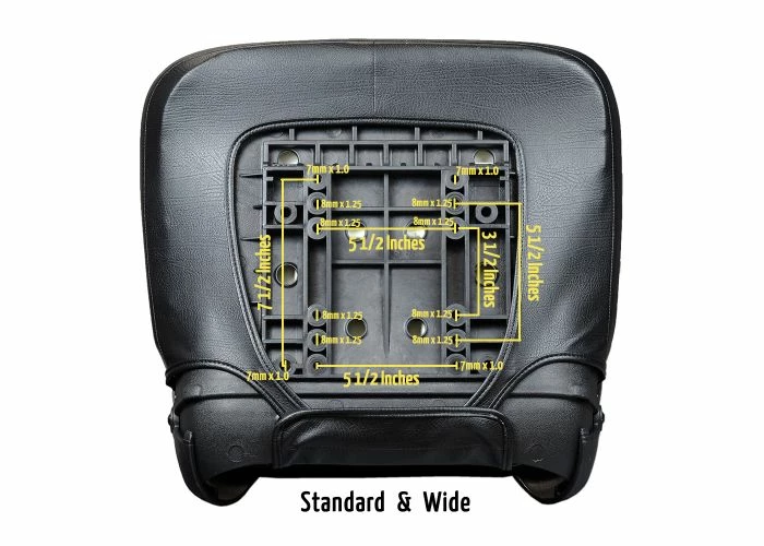Our universal seats’ undersides have 16 mounting holes, and will have four or more holes with threaded metal inside; all using a standard 8 mm x 1.25 thread and pitch. The additional non-threaded holes allow the user to use the seat with a wide range of manufacturers’ metal seat base brackets, or to secure the seat with various sizes of bolts. If you use these non-threaded holes, the nuts must be slipped in between the seat’s plastic base plate and the foam padding. This is much easier than it sounds. Please refer to the Specifications tab for additional hole spacing data.