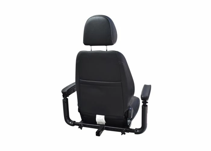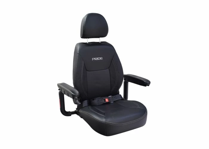 The fold-flat 18″x18″ Captain Seat assembly for the Jazzy Air power chair is covered in a black vinyl upholstery and comes with the headrest and a 60″ lap belt